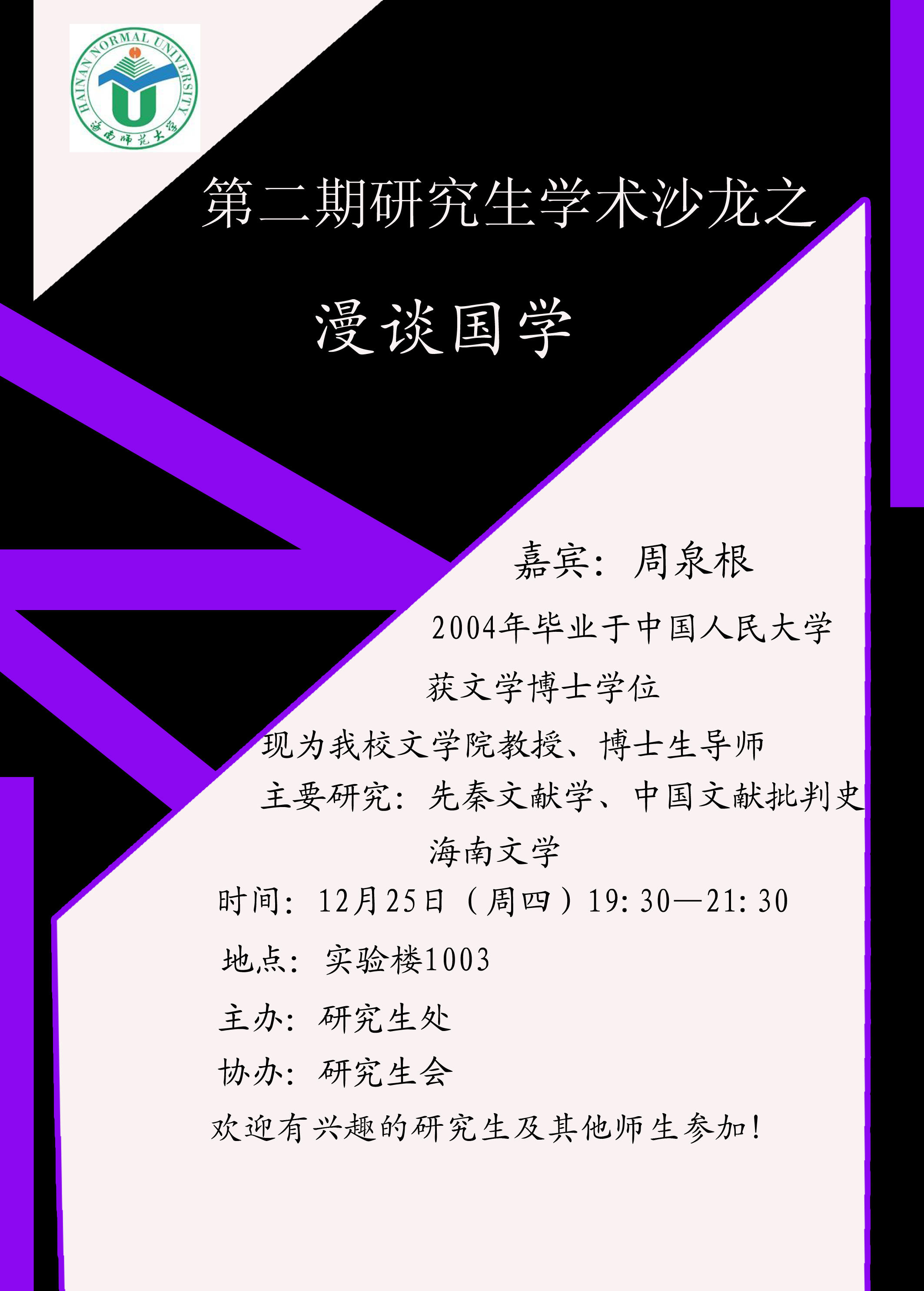 嘉宾:周泉根,2004年毕业于中国人民大学,获文学博士学位,现为我校文学院教授,博士生导师。主要研究先秦文献学、中国文学批评史和海南文史。