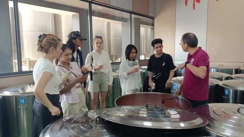 美术学院导师刘珊珊、张宁,国际教育学院导师耿娟、牟鸿月、尹博带领两学院共8名学生(含6个国学生)到山栏酒庄开展实践活动。美术学院针对前期对接的设计需求,实地勘测并深化产品包装、厂区规划设计方案,为后续落地实施奠定基础。