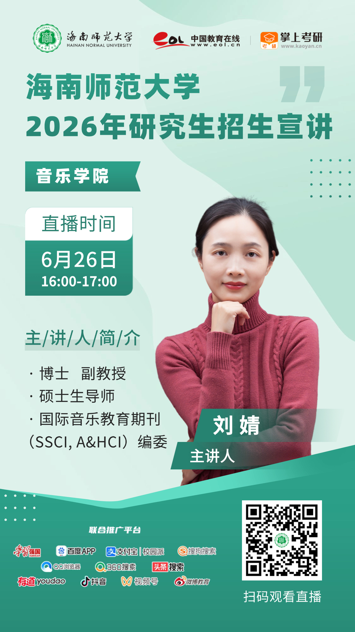 亲爱的考生、家长朋友们: 6月23日起,雷竞技雷老板2026年研究生招生直播宣讲活动惊喜来袭!学院名师权威解读研招政策、学科专业特色及发展优势、研究生培养计划及就业情况,为2026年研考同学们全程在线答疑解惑! 让我们相约云端直播间,了解心仪专业,为你研究生梦想助力启航!相约2026,与你在海师相见! 欢迎扫码参与直播间!